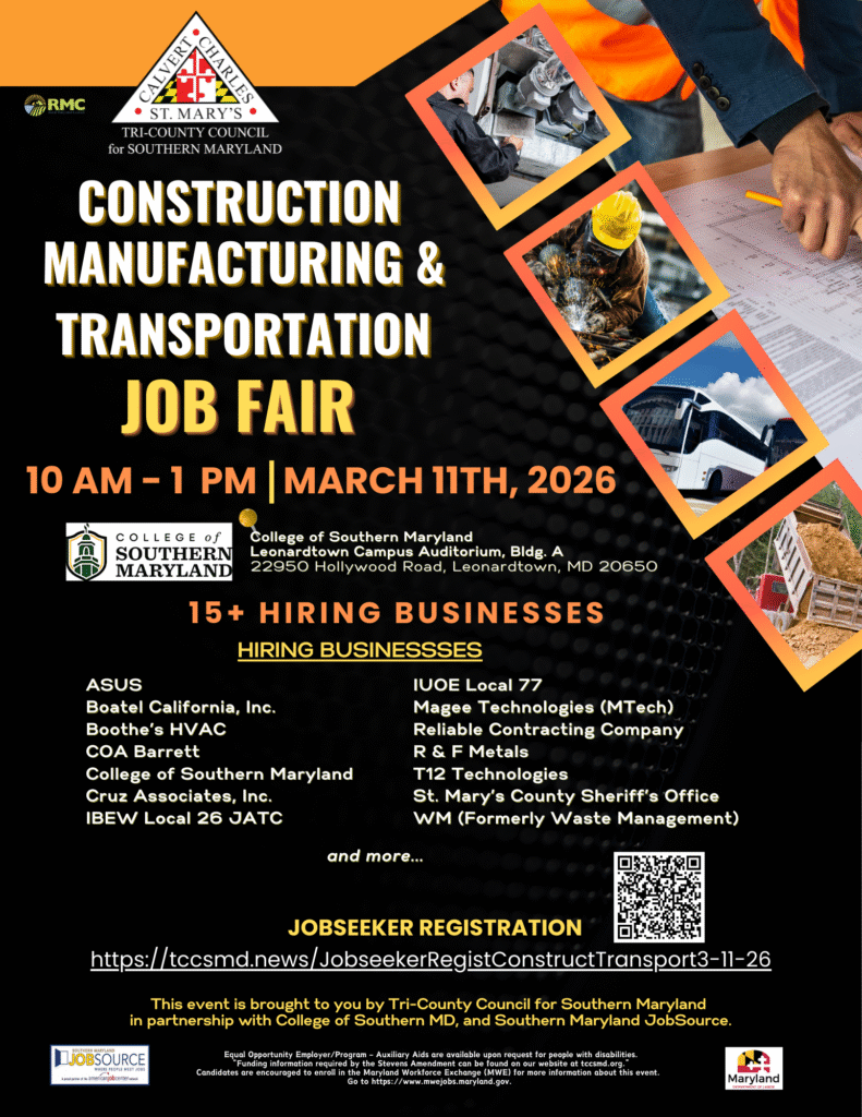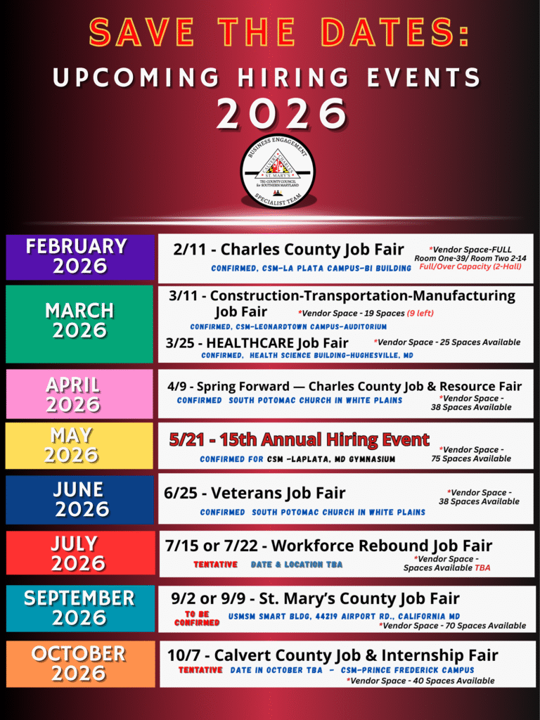The Tri-County Council for Southern Maryland’s Business Engagement team leads the region in workforce development by building skilled local talent, providing training solutions and recruitment support so that businesses can focus on growth and continue to thrive within Southern Maryland. The Business Engagement team provides a no-cost, consultative approach to help individual businesses get the results they want.