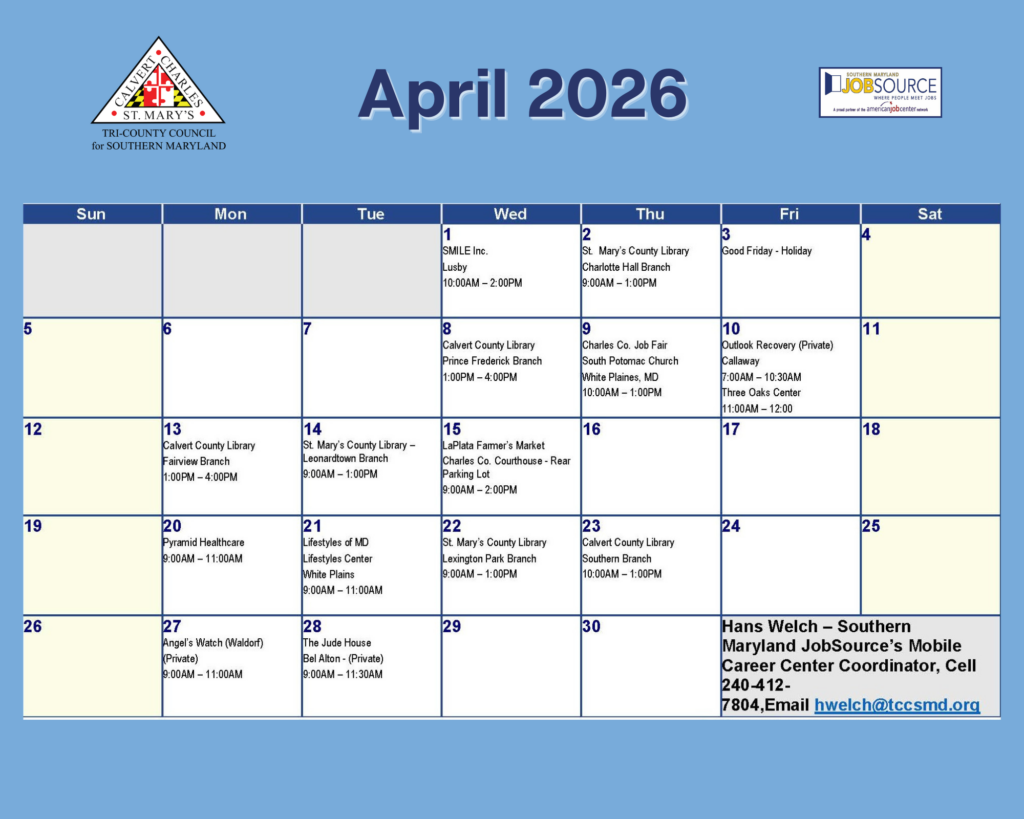 Want to visit one of our American Job Centers but can’t get to those offices? Find the Mobile Career Center around Southern Maryland! Click here
